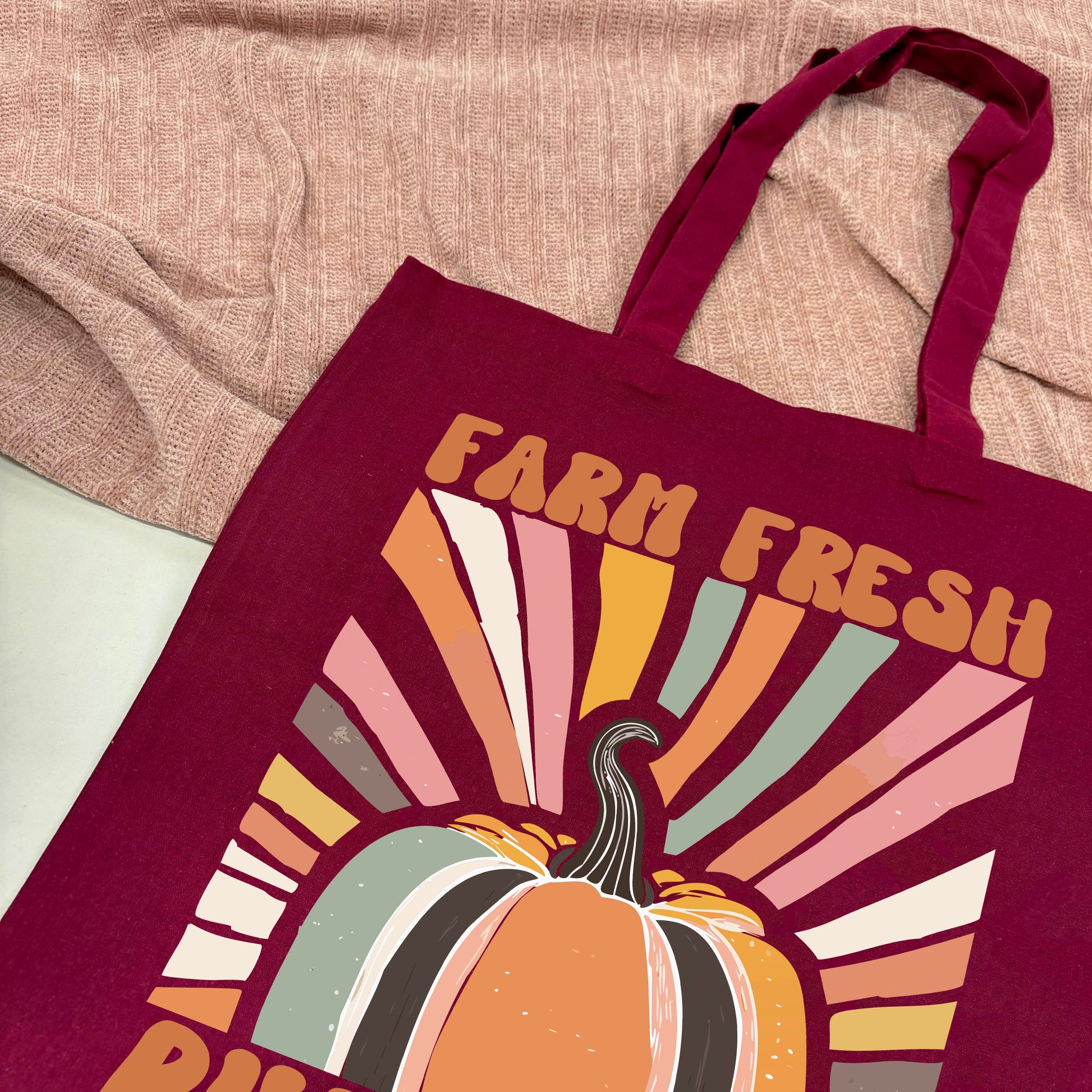 - The tote will be printed with a pumpkin graphic in the middle, with 'Farm Fresh Pumpkins' above and below.