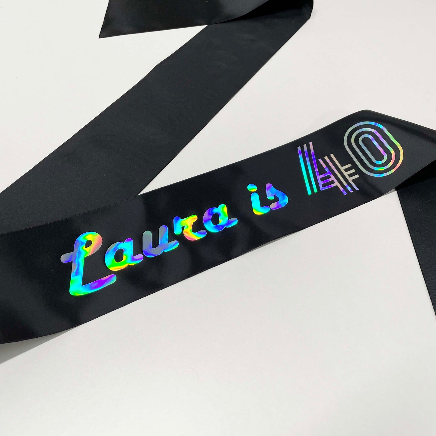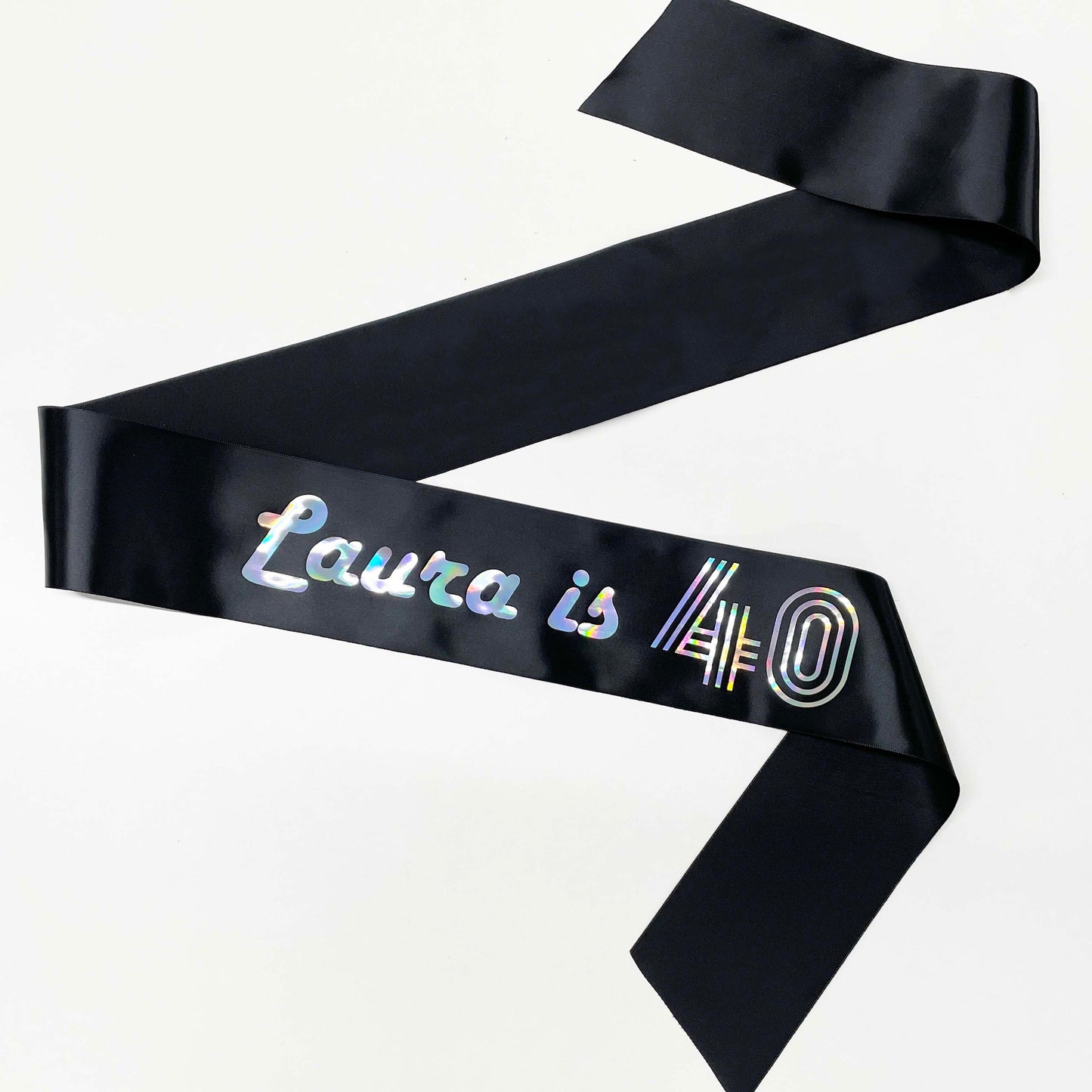 High quality, ribbon sash printed with (INSERT NAME) is (INSERT AGE) e.g. Laura Is 40.
