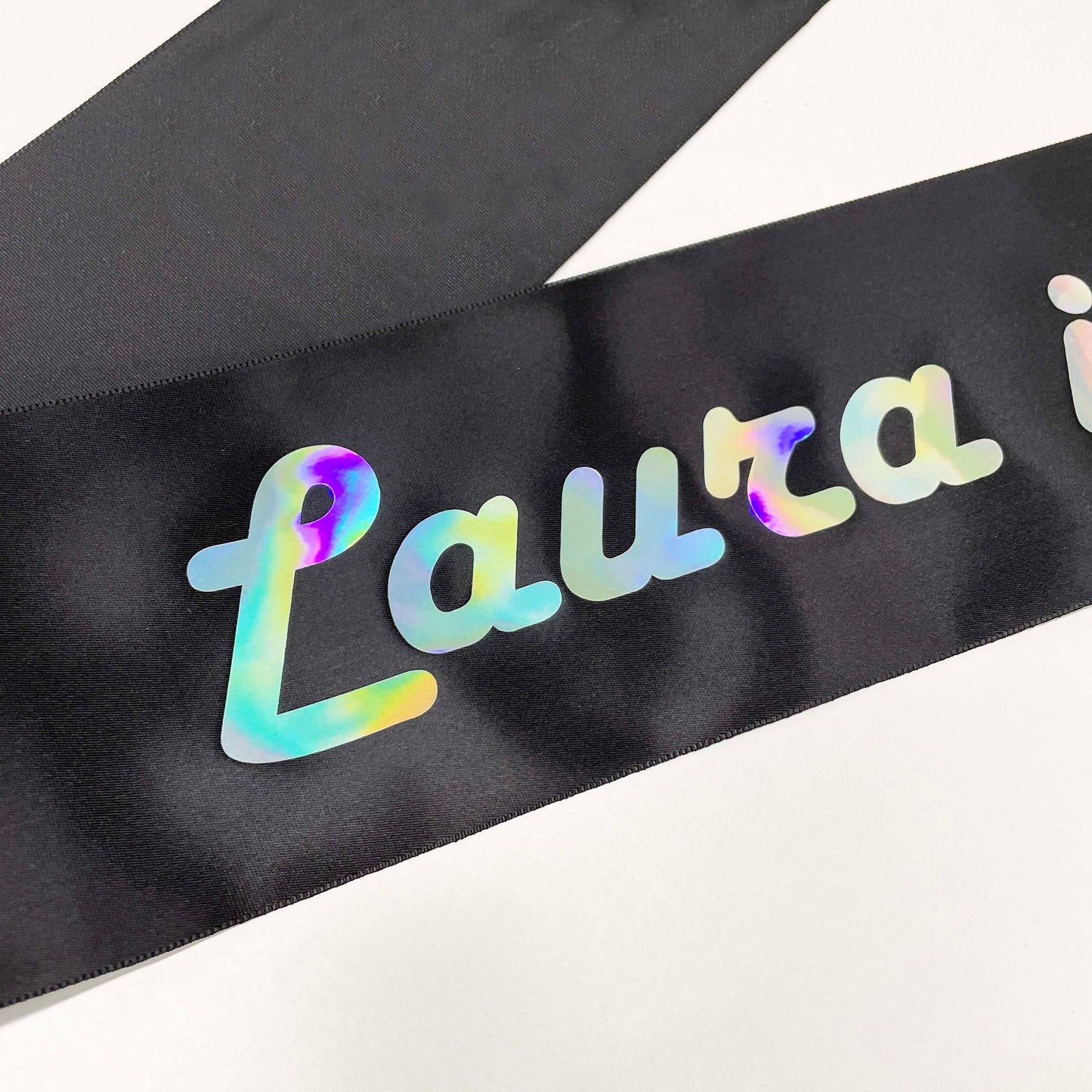 - Available in 21 ribbon colours, printed in a retro, disco-style font with holographic vinyl.