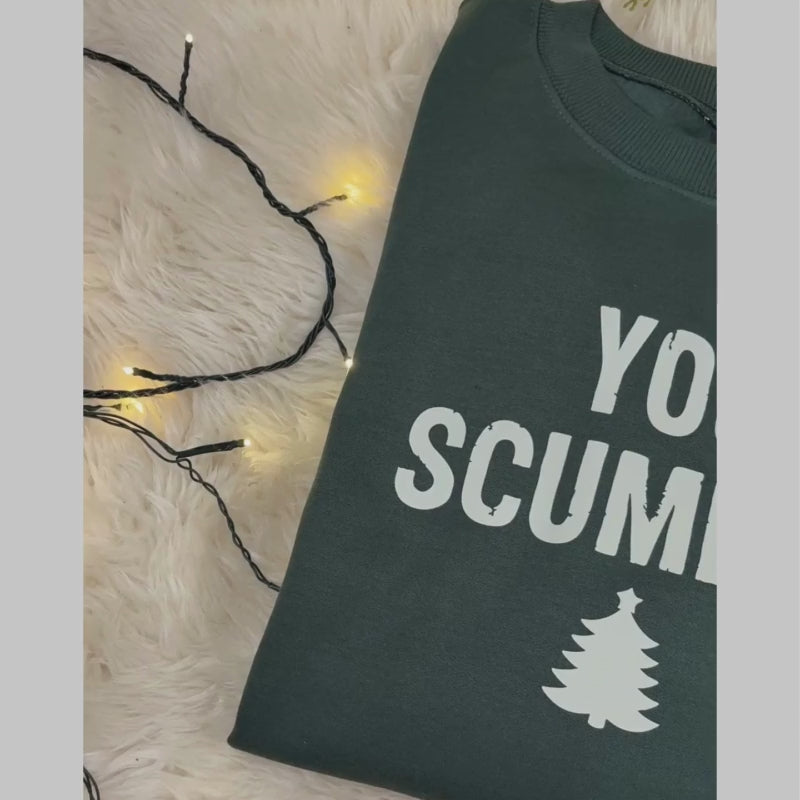 Set includes x2 Unisex Sweatshirts. 1 Printed with 'YOU SCUMBAG' and 1 Printed with 'YOU MAGGOT'. Both include a festive Christmas tree graphic underneath.