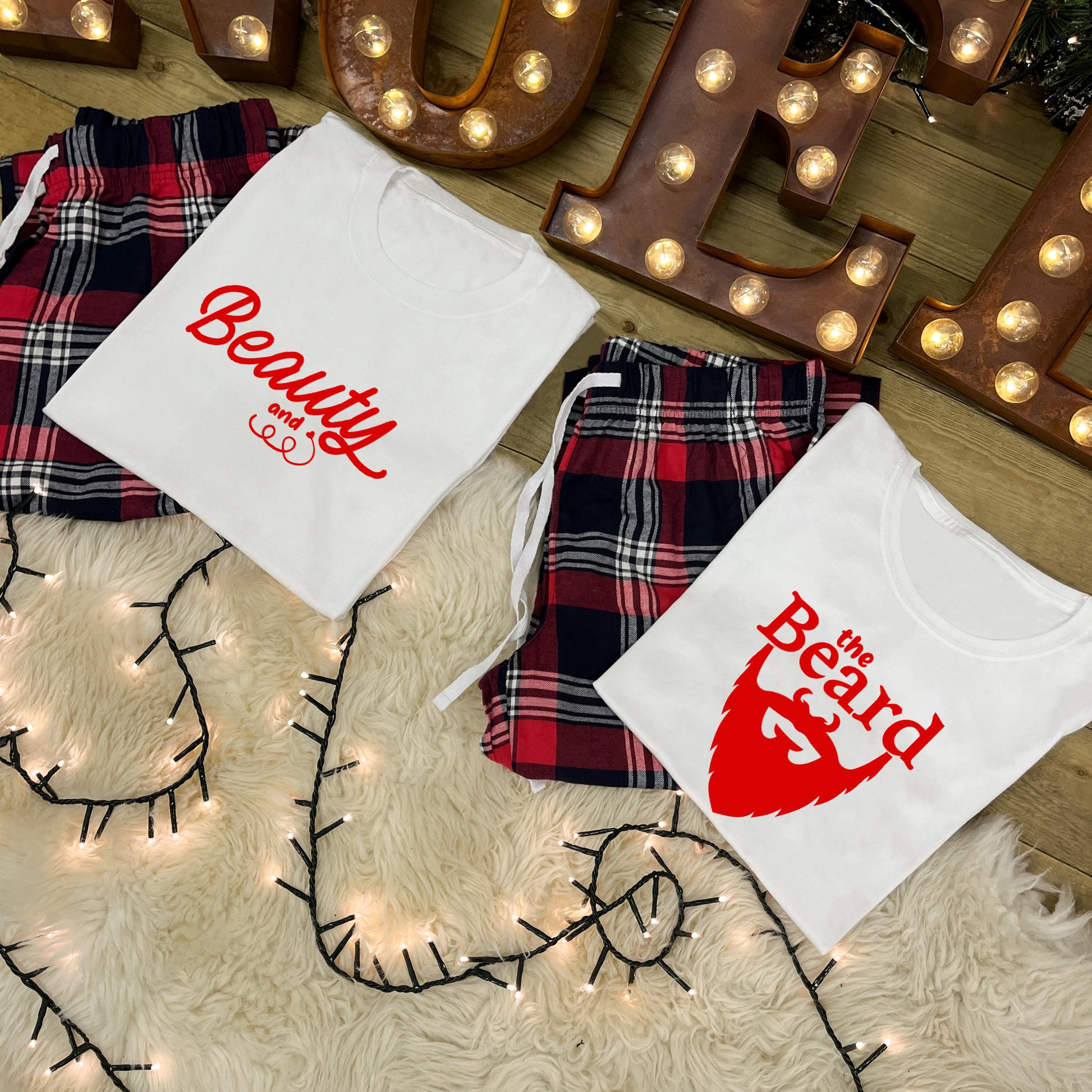 - Couples tartan pyjamas, including x2 pyjama sets printed with 'Beauty' on one set and 'The Beard' on another.