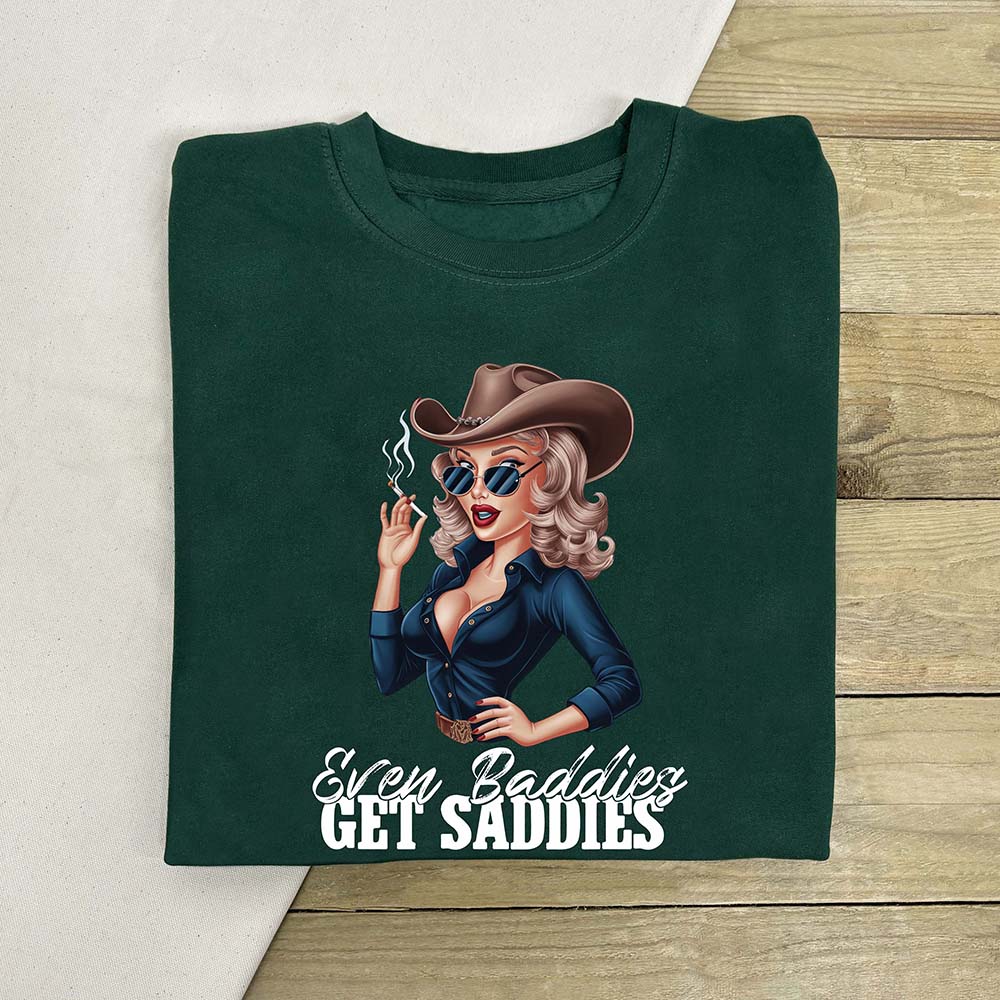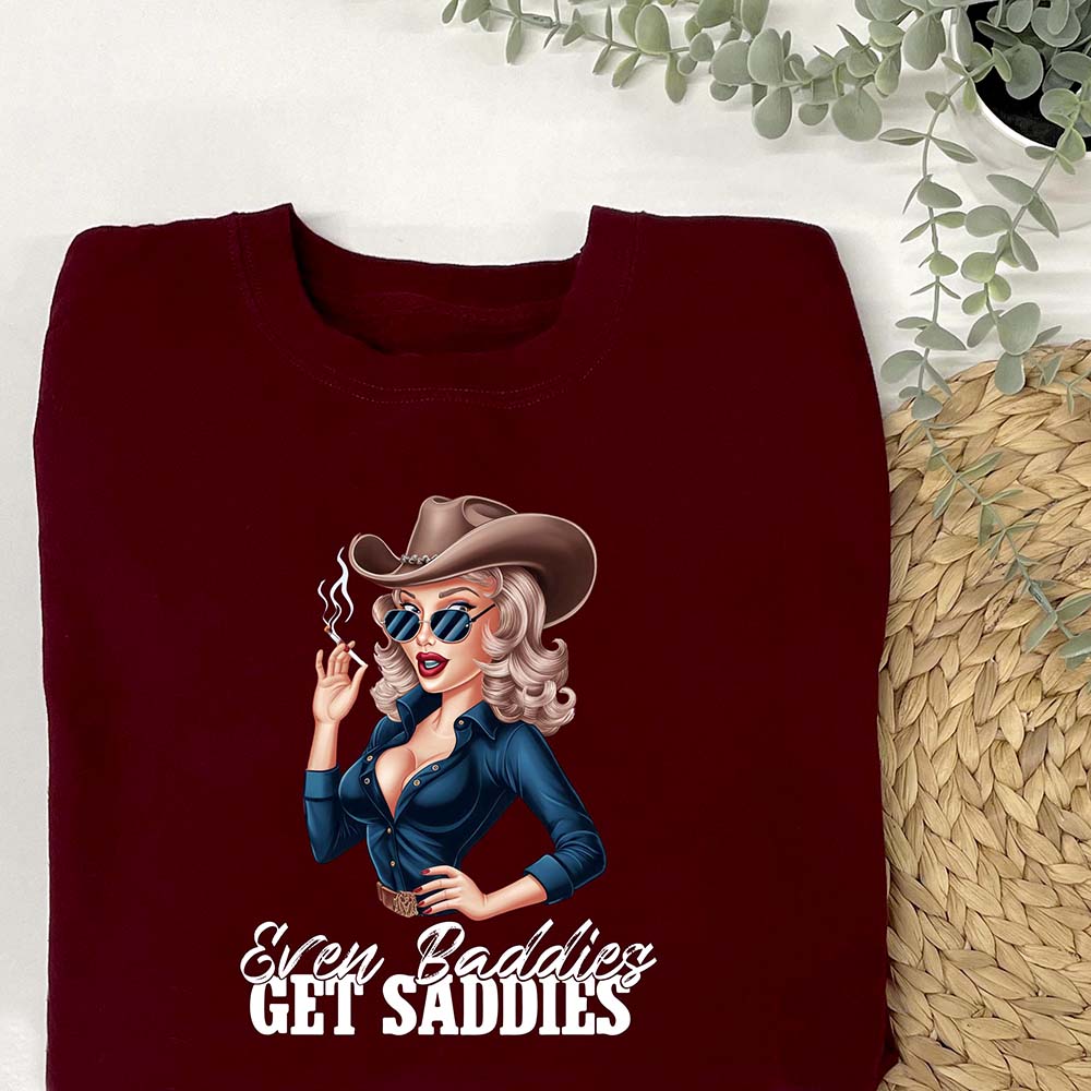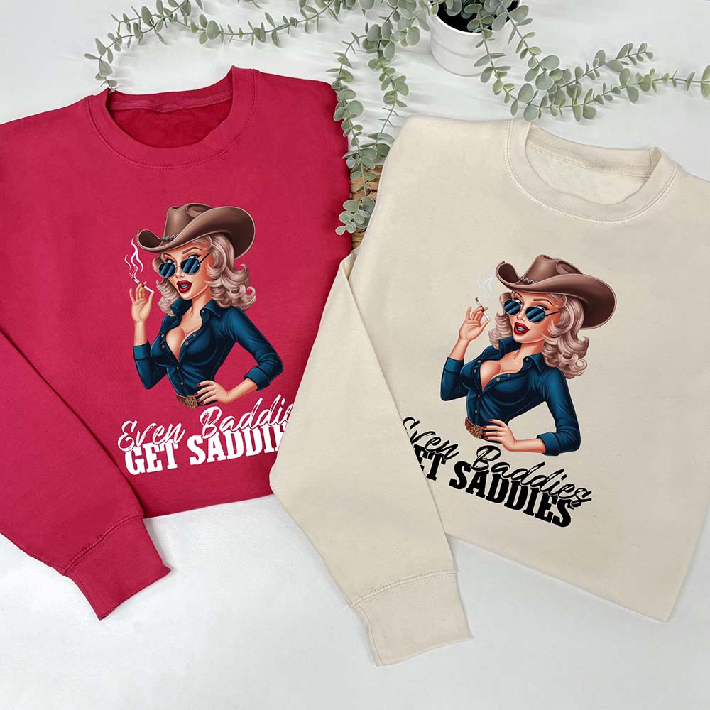 - The design features 'Even Baddies Get Saddies' printed across the chest with a western cowgirl above - as shown in the image. The cowgirl image will be as standard, we will choose white or black text depending which stands out best against the jumper colour chosen.