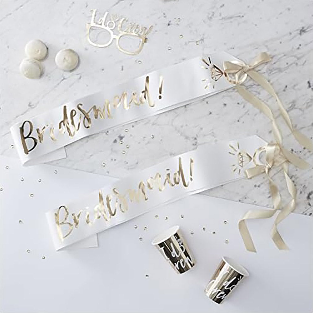 - ‘Bridesmaid' sash in ivory, printed with metallic Gold.