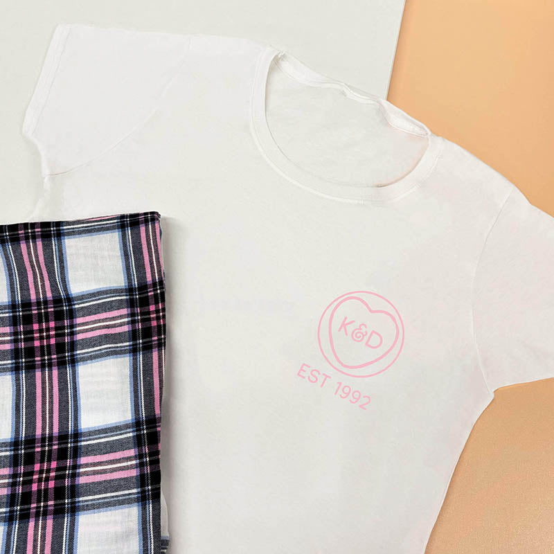 - Pastel pyjama set included a short sleeve t-shirt with a choice of pink plaid shorts or trousers.