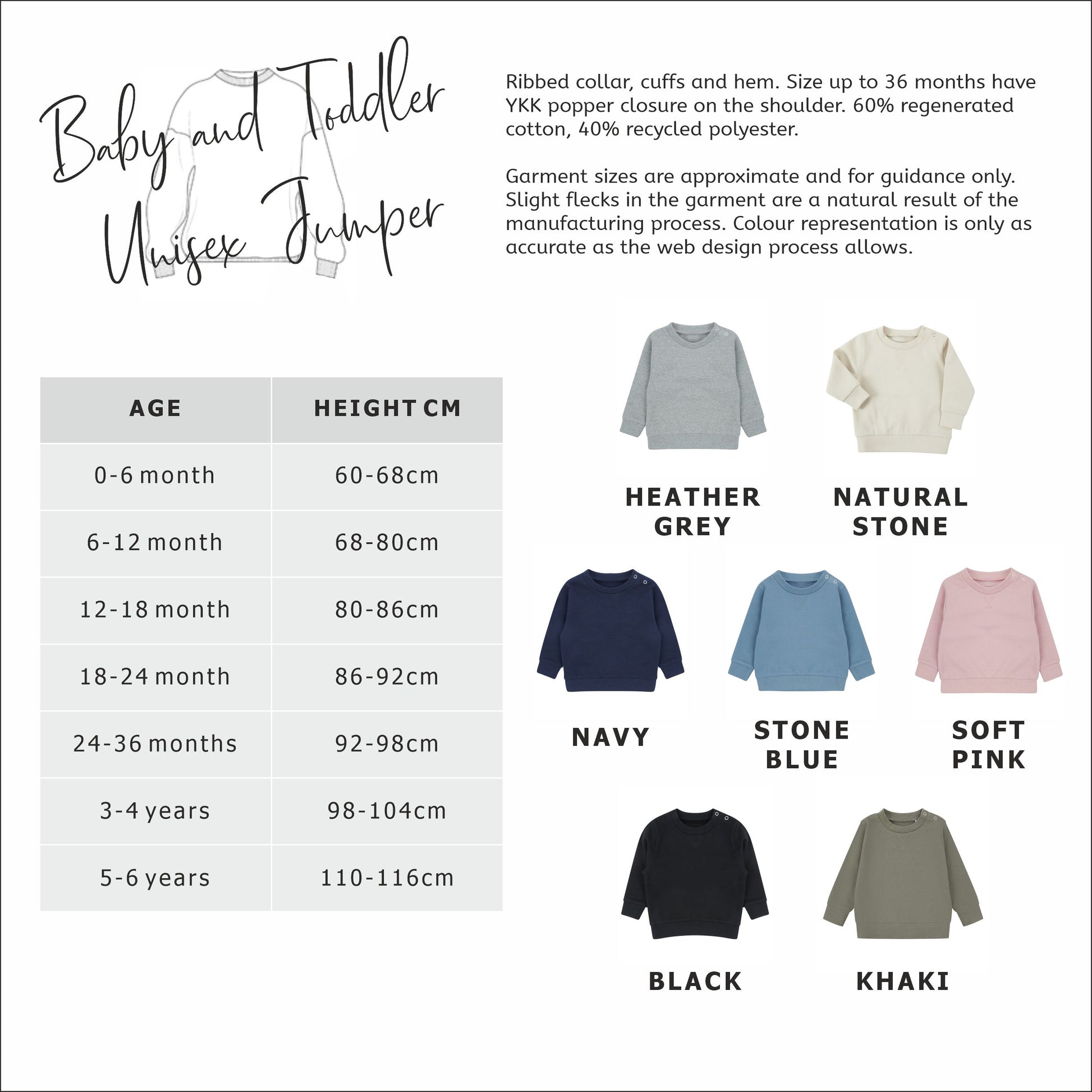 The jumper has poppers at the neck (in sizes 0-6 month through to 24-36 months) to make sure it is easy on and off for your little people, and includes a ribbed collar, cuffs and hem. Jumpers larger than 24-36 months have a standard round neckline. A brushed back fleece ensures a cosy fit for those Autumn days.