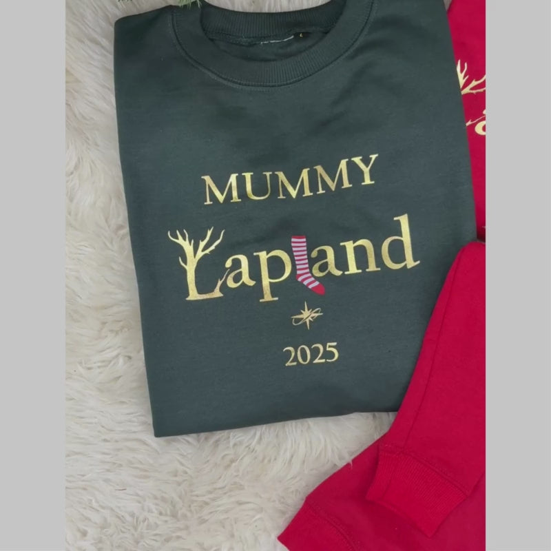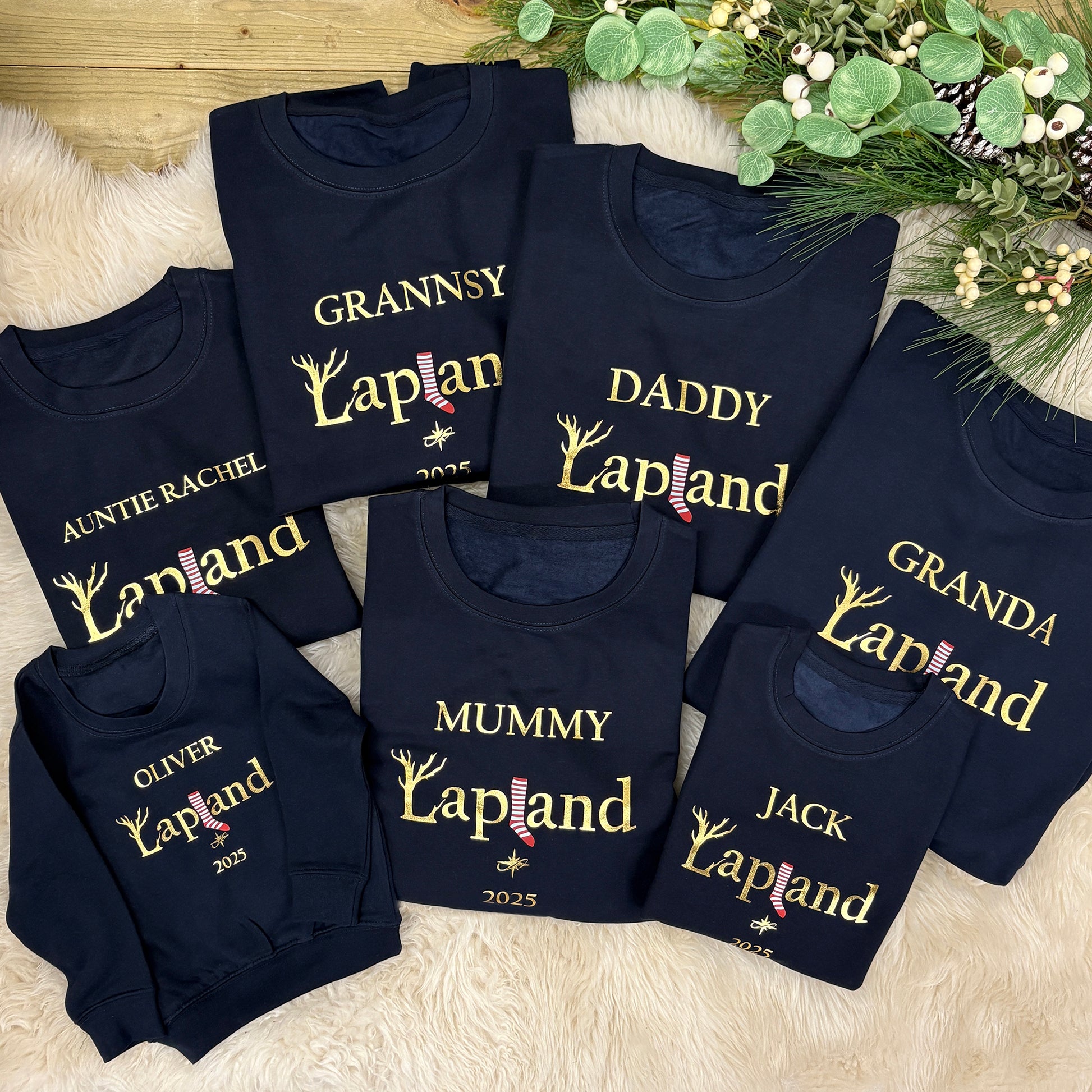 Jumper will be printed with ‘Lapland’ and your chosen name and year. The print will be in gold vinyl as standard, along with a red and white Christmas stocking.